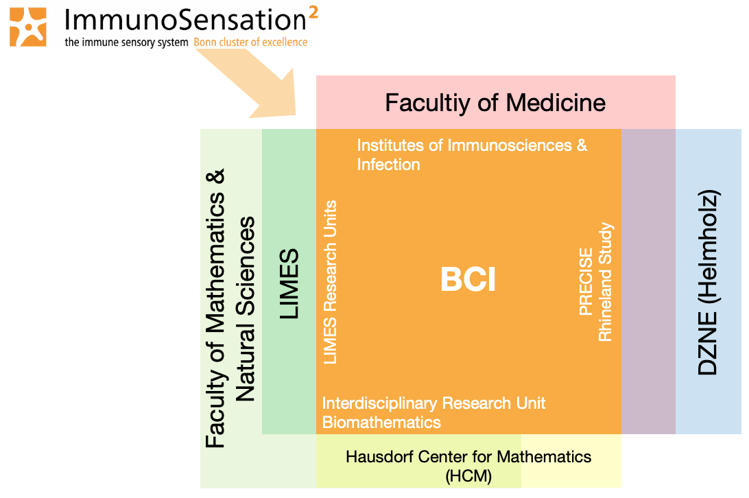 The BCI is an excellence center for immunology at all levels: structure, education, research and translation. It is a joint structure of two faculties at the University of Bonn, including the Faculty of Mathematics and Natural Sciences, and the Medical Faculty, together with the University Hospital Bonn (UKB) and the German Center for Degenerative Diseases (DZNE, Helmholtz). The center is closely associated with the Bonn Transdisciplinary Research Area life and health, modelling and sustainable futures, the Bonn Center of Mathematical Life Sciences (BCMLS), the Hausdorff Center for Mathematics (HCM), the Bonn Center of Medical Data Usage and Translation (ZMDT) and the faculties of Law and Economics as well as the faculty of Agriculture at Bonn University.
