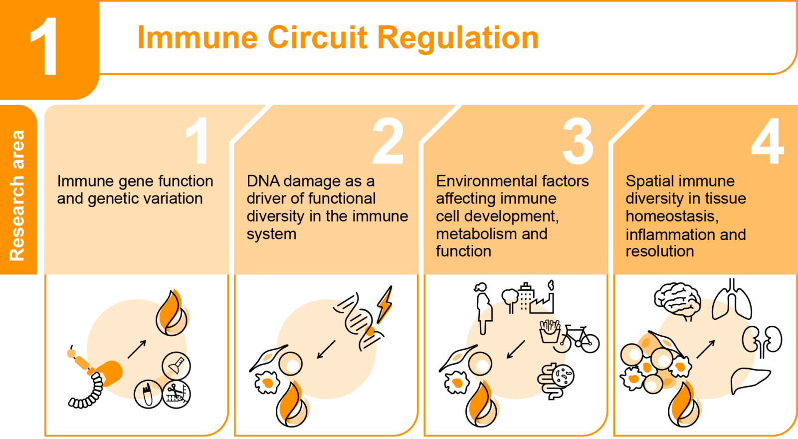 Research Program 1 Immune Circuit Regulation investigates immune diversity from its molecular basis at the protein and genomic levels to its network regulation in cells and tissues. Specifically, we address how this diversity at different organizational levels permits high interindividual variation and yet secures immune homeostasis and thus health. With this program, we reach beyond the paradigm of a single, idealized “textbook” immune system and instead appreciate that diverse variants of the immune system are a prerequisite of survival at the population level. Thus, we posit that a central focus of immunological research should be understanding the functional elasticity common to these different immune systems which allows them to maintain homeostasis under variable genetic and environmental influences.