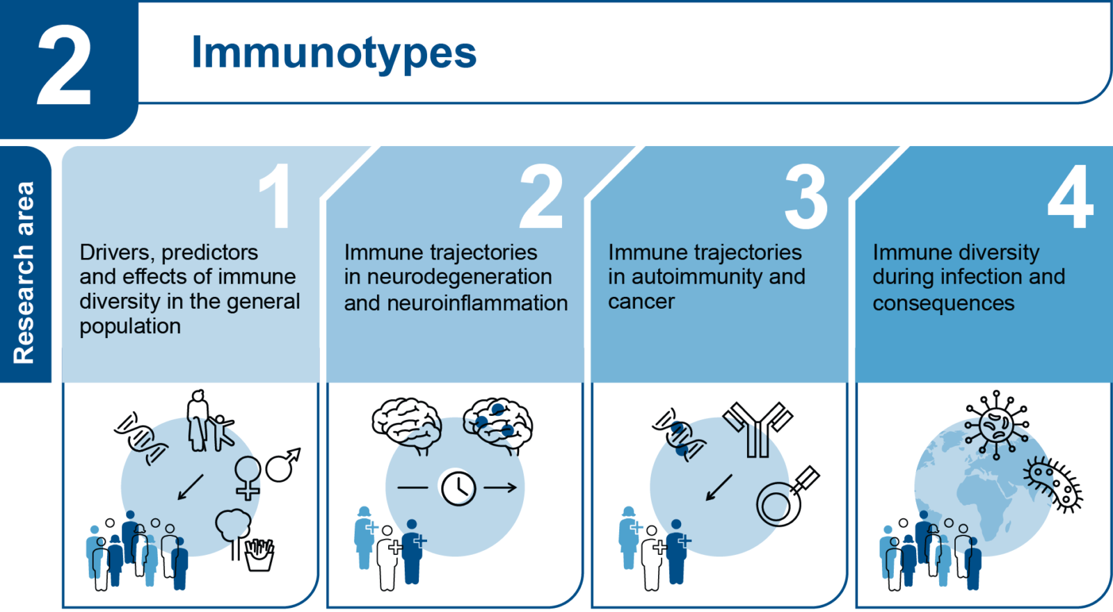 Research Program 2 Immunotypes approaches immune diversity through the analysis of diverse general population and disease cohort data. Comparing the general population (age, gender, lifestyle and living environment), patients with neurodegenerative disease and multiple sclerosis, with autoimmunity and hereditary cancer as well as with current and previous infections, we will utilize this incredible wealth of information about immune states and disease trajectories to identify relevant immunotypes and their clinical profiles. This systematic and precise assessment of immunotypes is designed to identify and categorize molecular and cellular patterns as well as markers for improved stratification and prediction of individual disease trajectories and risks. On the one hand, these analyses will identify key signaling pathways linked to certain common immune states and trajectories. They can then be further analyzed to understand the implications of these pathways for circuit immune regulation, and to identify potential molecular targets in this pathway, which can be followed by specific perturbation and intervention strategies. On the other hand, the genetic and environmental diversity underlying these immunotypes will also uncover rare immune gene variants which will again provide novel mechanistical insight for further studies, as well as informing appropriate clinical intervention strategies.