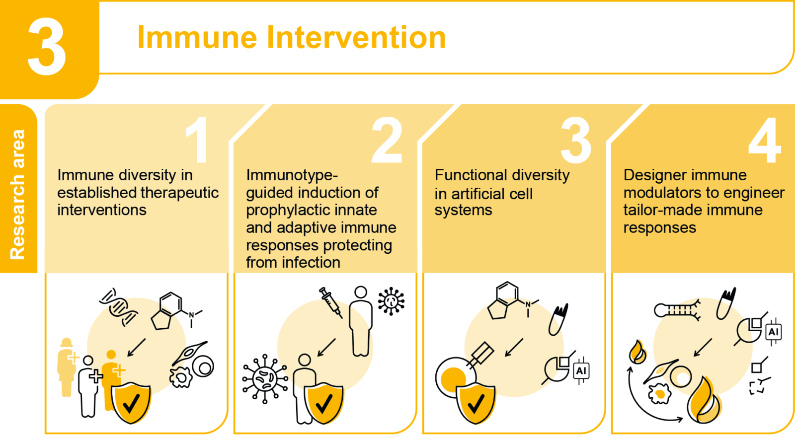 Research Program 3 Immune Intervention aims to integrate immune diversity and immunotype assessments into intervention strategies. Various advanced perturbation technologies are applied to precisely interfere with molecules, signaling pathways and key components of the immune regulatory network, as therapies and prophylaxis as well as in combination with cell therapies. While precise perturbation cues will propel studies on immune circuit regulation, newly developed, molecular tools have the potential to be implemented in future precision therapies. However, this research program will not only develop novel molecular tools, but also aims to apply knowledge about immunotypes to appropriately adapt and design other intervention strategies, such as lifestyle changes or the improved application of existing drugs.