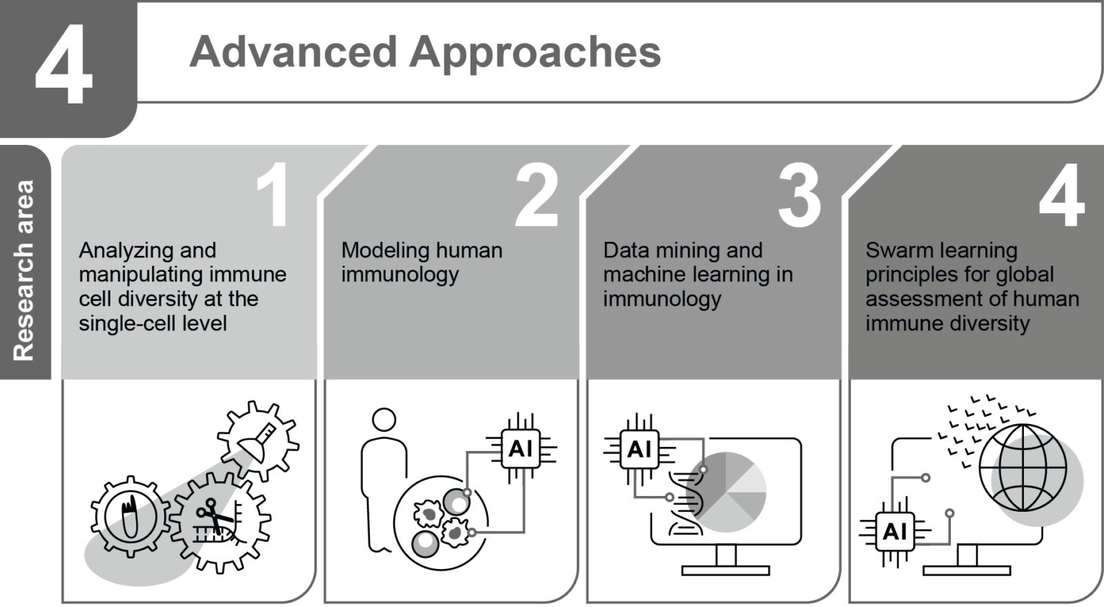 Research Program 4 Advanced Approaches goes beyond the boundaries of advanced, but established, technologies, and newly develops completely innovative approaches. The program allows the investigation of immune diversity in novel ways and applies these newly developed approaches to proof-of-concept studies that link them to the other three research programs.